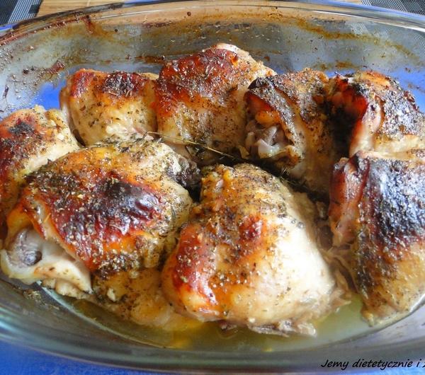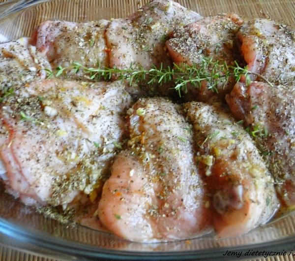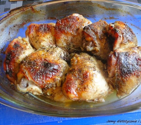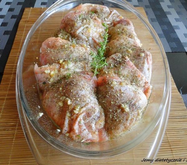 Składniki:- udka kurczaka (bez podudzi) - 8 szt.- 3 ząbki czosnku- potarta skórka z 1 cytryny- 1/4 łyżeczki kminku ( w całości)- 1/2 łyżeczki soli- 1 łyżeczka majeranku- 2 gałązki świeżego tymianku- pieprz- 1/2 łyżeczki kucharka- 1 łyżeczka miodu- 1/4 szklanki białego wina wytrawnego