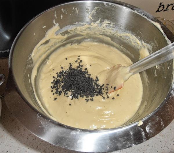 proszkiem do pieczenia, dodawać po łyżce do masy delikatnie aby nie naruszyć struktury piany mieszając na najniższych obrotach miksera.Wsypać kropelki