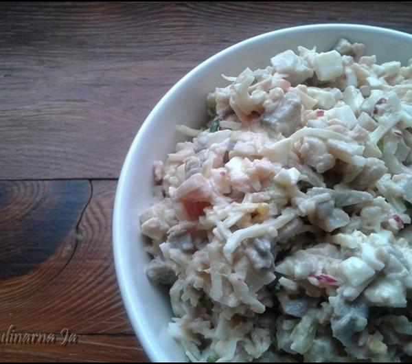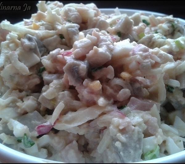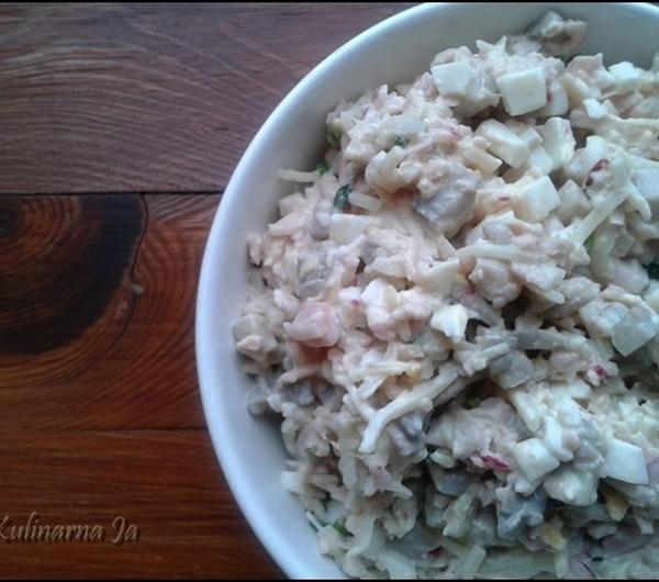 SKŁADNIKI:- 5 jajek na twardo- 30 dag pieczarek- 1/2 cebuli- 2 pęczki szczypiorku- pęczek rzodkiewki- słoik selera konserwowego- 30 dag szynki konserwowej- majonez- sól, pieprzPRZYGOTOWANIE:Pieczarki i cebulę kroimy w kostkę, dusimy na małym ogniu. Ugotowane jajka, szczypiorek i seler kroimy. Szynkę i rzodkiewkę trzemy na ratce o dużych oczkach. Wszystkie składniki mieszamy razem, dodajemy majonez i doprawiamy solą i pieprzem. Smacznego!