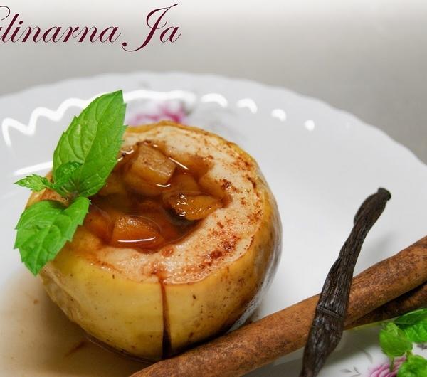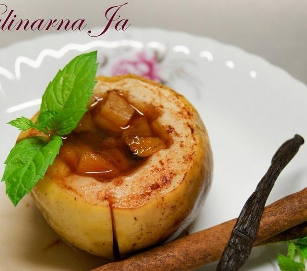 SKŁADNIKI:5 ulubionych jabłekpół słoiczka dżemu truskawkowego2 łyżki suszonej żurawiny4 suszone morelecynamon opcjonalniePRZYGOTOWANIE:Jabłka myjemy, odcinamy górę (tworząc z wierzchu kapelusiki) i wydrążamy małym nożykiem. Dżem mieszamy z żurawiną i pokrojonymi w kosteczkę morelami. Jabłka układamy na blasze, nadziewamy dżemem i posypujemy delikatnie cynamonem. Przykrywamy przygotowanymi kapeluszami i wkładamy do nagrzanego piekarnika do 180C. Pieczemy przez ok. godzinę. Smacznego!Rada: Jabłka nacinam po bokach by się nie rozpadły podczas pieczenia.