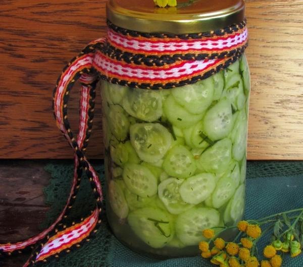 Ogórki obieramy i kroimy na cieniusieńkie plasterki.Umieszczamy je w słoiku w dość dużej ilości, jednak nie upychamy i wypełniamy słoik zalewą.Jak wspominałam - można do sałatki dodać startą na dużych oczkach/pokrajaną w paseczki świeżą