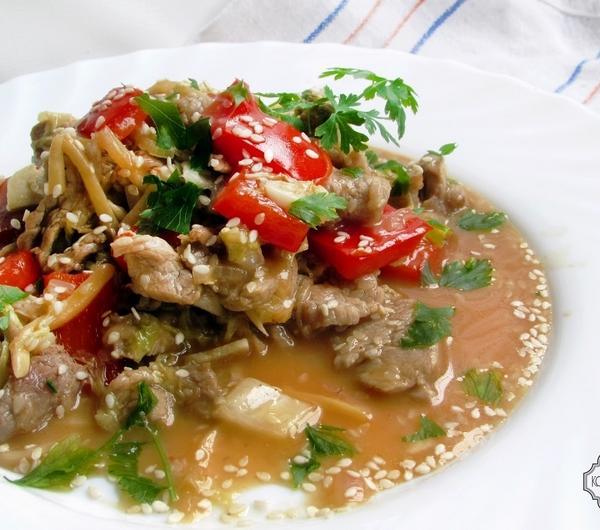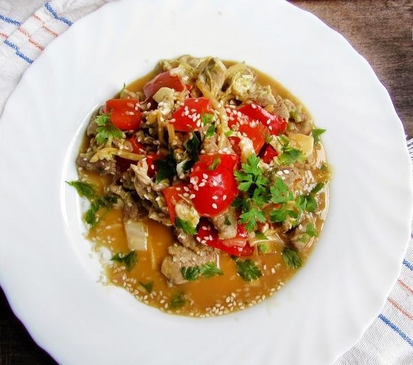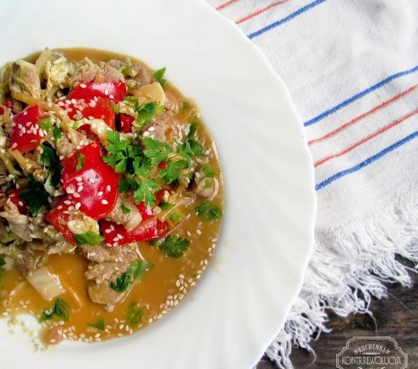 sezam oraz sos, który podczas smażenia dolewamy partiami.Przesmażamy całość jeszcze około 5 minut.Na koniec posypujemy potrawę