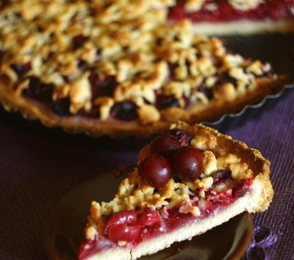 wiśnie oraz trzemy na tarce ( grube oczka ) mniejszą kulkę aby powstała nam kruszonka na wiśniach. Całą tartę pieczemy 30 minut w takiej samej temperaturze.Smacznego :)