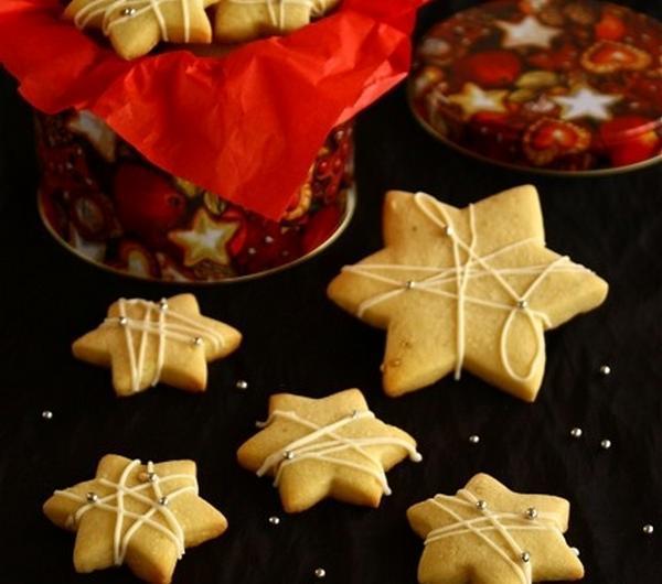 White Nougat Chocolate Stars150 g unsalted butter100 g sugarpinch of salt1 egg100 g white almond nougat chocolate (for example Toblerone)1 tablespoon of whipping creamzest of 1 lime325 g all-purpose flour+ melted white chocolate for decorationPreheat the oven to 180°C.Melt chocolate with cream in the bowl placed over saucepan of simmering water.Cream butter, add sugar, salt and egg and continue beating until pale. Add the lime zest, melted chocolate and flour, mix well. Shape into a ball, wrap in plastic, and refrigerate for 30 minutes.Roll out dough to a 7mm thickness, cut out cookies using cookie cutter and place them on a baking sheet lined with baking paper (be careful, dough is soft and fragile).Refrigerate cookies for 10-15 minutes.Preheat the oven to 180°C.Bake until they are just turning golden, about 11 minutes and transfer to racks to cool.When the cookies cool down you can decorate them with melted white chocolate.(recipe from : Betty Bossi – ‘Noël et ses friandises’)