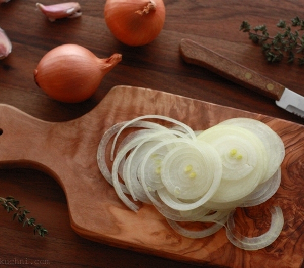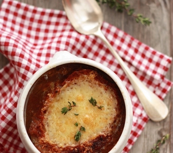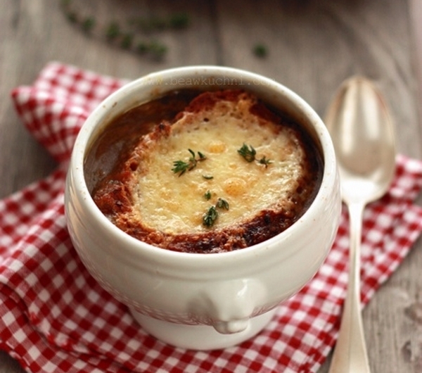 ‚Gdy daaawno dawno temu ;) po raz pierwszy spróbowałam we Francji zupy cebulowej, nie mogłam uwierzyć, że jest tam naprawdę tylko cebula! I że z cebuli można przygotować coś tak pysznego (pod warunkiem oczywiście, że nasz system trawienny nie buntuje się na sam dźwięk słowa ‘cebula’ ;)). Babcia Eliza (Mémé Elise, o której wspominałam między innymi à propos innej francuskiej zupy – soupe au pistou) mawiała, iż nie ma nic prostszego od zupy cebulowej – wszak wystarczy nam cebula i woda, trochę tłuszczu, ewentualnie liść laurowy czy tymianek + nieco wolnego czasu ;)‚