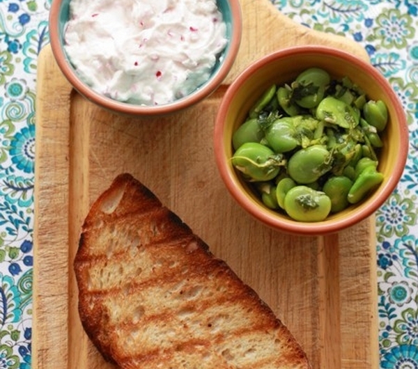 Grzanki z bobem i serowo-rzodkiewkowym krememok. 500 g bobu (waga po wyłuskaniu)mały pęczek rzodkiewek150 g kremowego serka (używam koziego lub owczego)2-3 łyżki jogurtu (w zależności od konsystencji, jaką chcemy otrzymać)sól, pieprz do smakupecorino lub parmezanoliwabazylia lub miętanieco otartej skórki z cytryny + ok. ½ – ¾ łyżki soku1 ząbek czosnku (można pominąć)kilka kromek chleba (do zapieczenia)Rzodkiewki umyć, osuszyć i zetrzeć na tarce (na grubych oczkach). Dodać ser i jogurt, wymieszać, doprawić do smaku.Bób ugotować na parze lub w lekko osolonej wodzie do miękkości (połowę ziaren wyciągam z garnka wcześniej, by pozostała lekko chrupka – po ok. 3 minutach – resztę gotuję kilka minut dłużej, by łatwiej można je było rozetrzeć). Bób po ugotowaniu natychmiast przełożyć do lodowatej wody, by zatrzymać proces gotowania oraz by zachować ładny, zielony kolor. Obrać z łusek i połowę rozetrzeć widelcem (lub lekko zmiksować), dodać starte pecorino lub parmezan (ok. 2-3 łyżki), drobno posiekane listki bazylii lub mięty, ok. 2 łyżki oliwy, sok i skórkę z cytryny oraz roztarty ząbek czosnku (można pominąć), wymieszać, dodać resztę zachowanego bobu, doprawić do smaku.Chleb zrumienić kilka minut na suchej, rozgrzanej patelni (lub w piekarniku, tosterze czy na patelni grillowej) i każdą kromkę skropić lekko oliwą (tradycyjnie tego typu grzanki naciera się również ząbkiem czosnku, tym razem jednak etap ten pomijam, jako iż czosnek jest już składnikiem pasty…). Posmarować chleb kremem rzodkiewkowym, a następnie nałożyć ok. 2 łyżki bobu. Przed podaniem posypać dodatkowo wiórkami sera.(inspiracja – ten oto przepis Béatrice Peltre, u mnie jednak w wersji mocno uproszczonej…)‚