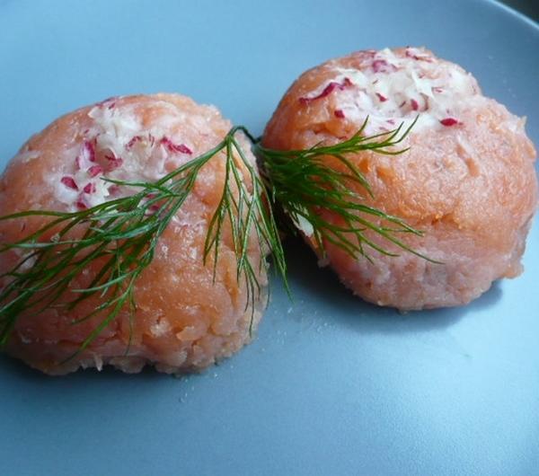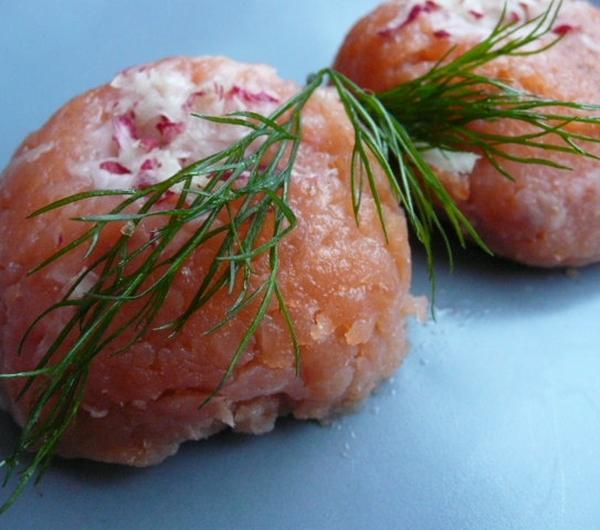 Rzodkiewkę myję i siekam jak najdrobniej. układam na talerzu kuleczki tataru - można użyć łyżeczki do