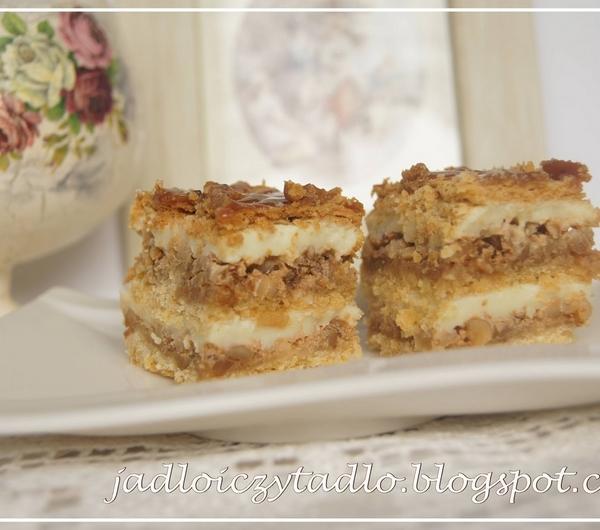 Ciasto:1 kostka margaryny4 żółtka3 szklanki mąki pszennej2 płaskie łyżeczki proszku do pieczenia2 łyżeczki cukru pudruMasa krówkowa;400 g cukierkówkrówekok 1 szklanki mleka400 g orzechów włoskich2 budynie śmietankowe, waniliowe lub karmeloweCiasto wyrobić i włożyć do lodówki na 30 minut.Cukierki rozpuścić w mleku na bardzo wolnym ogniu, często mieszając. Na końcu masa musi mieć konsystencje gęstej śmietany. Orzechy rozdrobnić na drobno i dodać do masy kówkowej, trochę masy zostawić na polewę.Ciasto dzielimy na 3 równe części i rozwałkujemy na wielkość średniej blachy lub też wylepiamy blachę ciastem. Na dwa placki wykładamy masę krówkową, jeden placek pozostaje bez masy. Wszystkie placki pieczemy w 170 stopniach przez ok 25 minut. Placki z masą krówkową przykrywamy pergaminem, gdyż orzechy bardzo szybko się przypalają.Gotujemy budynie w 3 i 1/2 szklance mleka. Połowę budyniu wylewamy na upieczone ciasto krówkowe i przykrywamy drugim ciastemkrówkowym, na to pozostały budyń i ostatnie ciasto bez masy krówkowej. Całość polewamy pozostałą masą krówkową bez orzechów.;