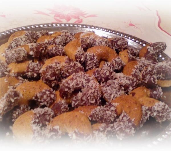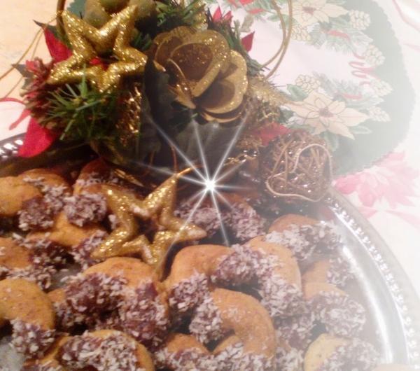 SKŁADNIKI20 dag margaryny2 jajka100 g cukru pudru\200 g zmielonych orzechów laskowych lub włoskich200 g maki pszennej100 g czekolady2 łyżki śmietany50 g wiórek kokosowychWYKONANIEUcieramy margarynę z cukrem i jajkami. Dodajemy mąkę i orzechy laskowe . Dobrze mieszamy (najlepiej szybko wyrobić ręką) odstawiamy do lodówki na 2 godziny. z ciasta formujemy ręka kształt małych rogalików, układamy na blaszce wyłożonej pergaminem. Pieczemy ok 15 min. temperaturze 200 stopni.Ciasteczka ostudzamy. w tym czasie czekoladę wrzucamy do garnuszka, dodajemy 2 łyżki śmietany. Czekamy od czasu, do czasu mieszając, aż wszystko się połączy i czekolada rozpuści.Końcówki rogalików maczamy w czekoladzie, obsypujemy wiórkami kokosowymi.. Czekoladę rozpuścić w kąpieli wodnej. Zanurzać rogalika w czekoladzie i obsypać zmielonymi orzechami laskowymi.