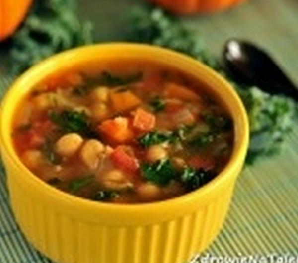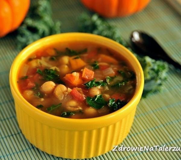 Składnikidynia pokrojona w kostkę - ok. 2 szklankiczerwony ziemniak - 1 sztukacebula - 1 sztukaczosnek - 3 ząbkidrobno pokrojne pomidory - 1 puszka lub 1.5 szklankiquinoa, kasza jaglana lub pęczak - 1/4 szklankiseler naciowy - 2 pałkiposiekane liście jarmużu - 2 szklankisól, pieprz - do smakuugotowana cieciorka - 1.5 szklankibulion warzywny lub woda - 4-5 szklaneknać pietruszki - 1/2 pęczkaInstrukcjeCebulę, seler i czosnek pokrojone w kostkę podsmażamy ok. 5 min na oleju.Do powyższych składników dodajemy pokrojoną w kostkę dynię i czerwonego ziemniaka, i smażymy ok. 10 min.Podsmażone warzywa zalewamy bulionem (lub wodą), dodajemy Quinoa i pomidory i gotujemy ok. 15 lub do miękkości.Pod koniec gotowania wrzucamy pokrojny na drobno jarmuż i gotujemy aż będzie lekko miękki, po czym dajemy ugotowaną cieciorkę.Przepisa dla 4 osób.
