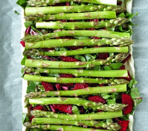 buraczki (unikniemy niespodzianki z łyka, jeśli trafi się sabotażysta).Na ponakłuwanym cieście francuskim rozkładamy liście, na nich łodygi, a na nich pokrojone w półplasterki, bardzo cienko,