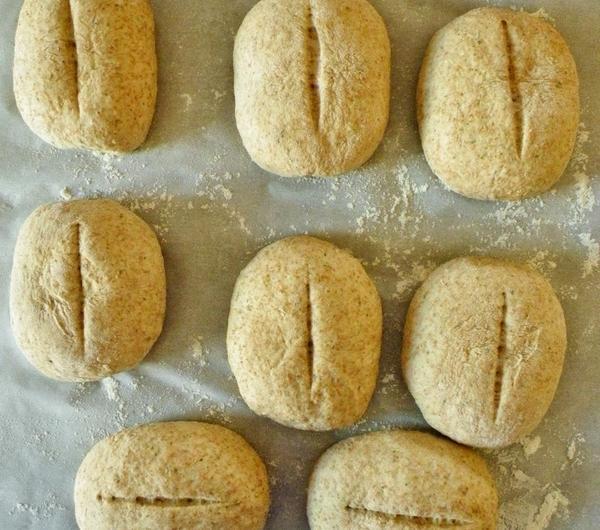 oliwą miski i odstawić do wyrośnięcia. Po tym czasie przełożyć ciasto na omączony blat i podzielić na 8 części. Złożyć dwa naprzeciwległe boki,