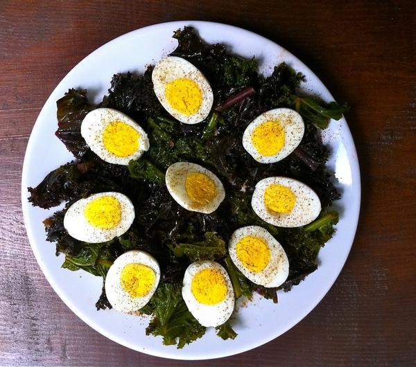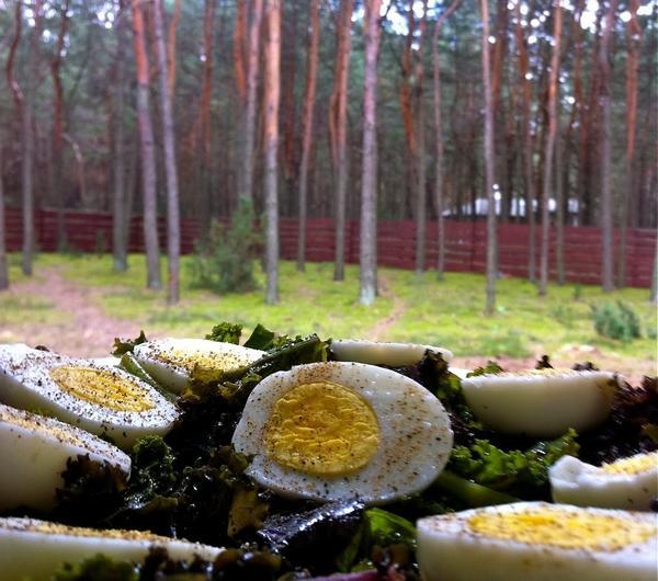 Skład:ugotowane jajajarmuż (kilka liści)sos sojowy tamari lub shoyuszlachetna oliwa (np z pestek słonecznika)cytrynapieprzJarmuż ugotuj saute, na parze lub w bardzo małej ilości wody (podlewaj jeśli się wygotuje), do zjadliwej przez Ciebie postaci (ja lubię lekko al dente), następnie odcedź i wymieszaj z sokiem z cytryny, sosem sojowym i oliwą (proporcje zależą od Twoich preferencji).Wyłóż na talerz, połóż nań ugotowane jajka i posyp pieprzem.Jarmuż to bardzo wartościowa odmiana kapusty, zwłaszcza dla wegetarian, ponieważ posiada duże ilości łatwo przyswajalnego żelaza.Smacznego!:)