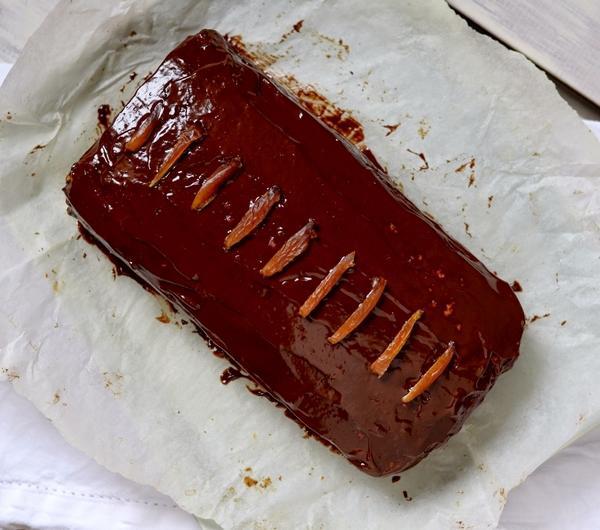 Czekoladą pokryłam ciasto, udekorowałam paseczkami