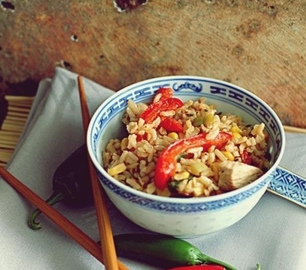Na dobry początek marca:)Lista zakupów dla 4 osób:1/2 kg piersi z indyka3 łyżki oleju z orzeszków ziemnych1 czerwona papryka1 łyżeczka posiekanego świeżego korzenia imbiru3 gałązki szczypiorku4 - 6 łyżek kukurydzy z puszki1 szklanka ryżumarynata:1 łyżka miodu1 łyżka sosu teriyakiMięso pokroić w kostkę. Składniki marynaty wymieszać z mięsem. Odstawić na godzinę do lodówki. Paprykę pokroić w paski, szczypiorek posiekać. Ryż ugotować zgodnie z instrukcją na opakowaniu. Odcedzić.Rozgrzać olej, wrzucić mięso i na dużym ogniu zrumienić. Zmniejszyć ogień, smażyć 6 min. pod przykryciem, dodać paprykę, kukurydze i szczypiorek. Cały czas mieszać. Dodać ryż. Zwiększyć ogień i smażyć wszystko razem 3-4 min.Dodać posiekany imbir, dokładnie wymieszać, doprawić solą i pieprzem do smaku.Smacznego życzy oliwek :)
