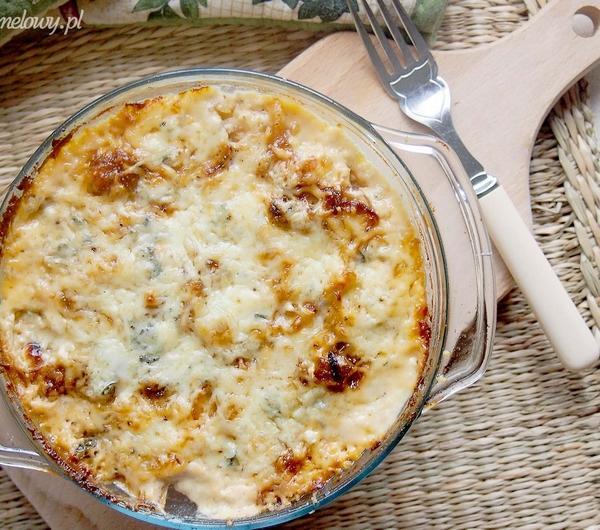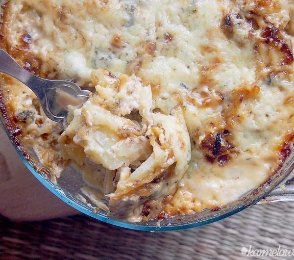 (4 porcje)Składniki:4 szklanki ziemniaki, pokrojonych w cienkie plasterki ok. 0,3 cm3/4 szklanki rozdrobnionego sera z niebieską pleśnią1/2 szklanki startego sera Gruyere (lub innego ulubionego)2 ząbki czosnku1 gałązka świeżego tymianku2 szklanki śmietanki 18 %sól i pieprzSkładniki na karmelizowaną cebulę:2 małe cebule, pokrojone w cienkie plasterkioliwa z oliwek i masło do smażeniasólszczypta cukruPrzygotowanie cebuli:Do dużej patelni najlepiej z grubym dnem wlej łyżkę oliwy, dodaj łyżkę masła i cebulę. Posyp solą i dokładnie wymieszaj, tak by dokładnie pokryła się oliwą i rozłóż równomiernie na dnie patelni. Postaw patelnię na średnim ogniu (u mnie 4 w 10 stopniowej skali) i powoli smaż. Całość smażenia powinna zając około 45 minut.Od czasu do czasu zamieszaj, by cebula równomiernie brązowiała. Jeżeli zbyt szybko brązowieje zmniejsz ogień do małego, wlej chlust wody i zamieszaj.Po około 15 minutach wsyp szczyptę cukru. Jeżeli cebula zacznie przywierać do dna patelni wlej odrobinę oleju. Smaż mieszając od czasu do czasu, aż cebula nabierze głębokiego, brązowego koloru.Przygotowanie zapiekanki:Włącz piekarnik i ustaw go na 200 °C. Przygotuj naczynie do zapiekania o średnicy 20 cm.W średnim garnku wymieszaj ziemniaki, śmietankę, czosnek, tymianek, dopraw solą i pieprzem i doprowadź do wrzenia. Następnie zmniejsz ogień i często mieszając gotuj przez kilka minut, aż śmietanka lekko zgęstnieje. Zdejmij z ognia i wyrzuć tymianek.Natłuść masłem naczynie do zapiekania i wyłóż na dno 1/3 ziemniaków na nie 1/3 cebuli i 1/3 sera pleśniowego. Dopraw solą i pieprzem i kontynuuj wykładanie z podanej kolejności doprawiając solą i pieprzem po każdej warstwie. Zalej ziemniaki pozostałą śmietanką i posyp serem gruyere.Przykryj folią aluminiową i włóż do piekarnika. Piecz przez 30 minut, po czym zdejmij folię i piecz kolejne 10 minut, aż ziemniaki będą miękki a ser się ładnie zarumieni.Smacznego!