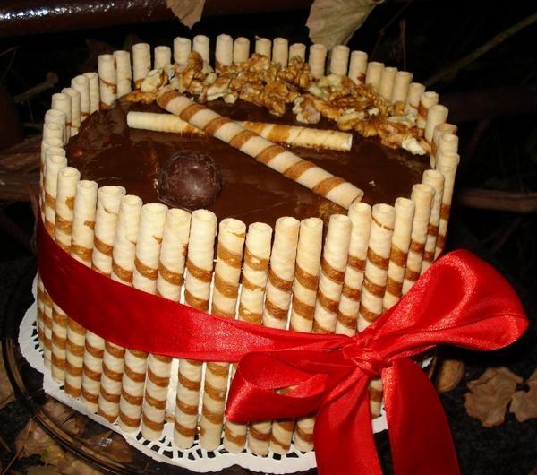 . Tort dookoła obłożyć rurkami waflowymi. Na wierzchu posypać