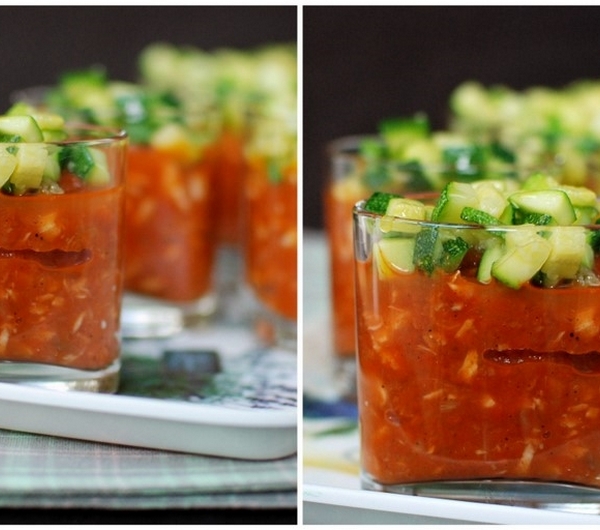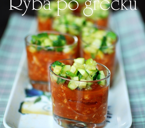 Oto prawie tradycyjna ryba po grecku w wydaniu „glamour” :)Usmażony, świeżutki sandacz zanurzony w aromatycznym pomidorowo-marchewkowym sosie, ozdobiony „kosteczkami” z młodziutkiej cukinii to idealna przystawka. Jednocześnie smaczna i bardzo elegancka :)Składniki: (6 małych porcji)1 duży filet z białej ryby (u mnie sandacz)1 marchew1 cebula1/2 jabłka1-2 szklanki pikantnego soku pomidorowegokilka kropli Tabasco lub szczypta chilli (opcjonalnie)1 młoda cukinia1 ząbek czosnkuoliwa z oliweksól i pieprz1 łyżka soku z cytrynyWykonanie:Rybę oprószyć solą i pieprzem i usmażyć na oliwie. Podzielić na małe kawałki, usuwając przy okazji wszystkie ości.W rondlu rozgrzać 4 łyżki oliwy. Zeszklić na niej posiekaną cebulę. Dodać startą na grubej tarce marchew oraz jabłko. Smażyć na średnim ogniu przez około 10 minut. Dodać 1 szklankę pikantnego soku pomidorowego. Warzywa dusić do miękkości około 20 minut. W czasie duszenia dolewać pozostały sok pomidorowy. (Uwaga: Gotowa pasta warzywna powinna mieć konsystencję „gęstego sosu”. Musi być jednak na tyle płynna aby ryba mogła nią przesiąknąć.) Doprawić do smaku solą, pieprzem, Tabasco i sokiem z cytryny.Do sosu dodać rozdrobnioną rybę i wymieszać. Rozłożyć do szklanych naczynek.Cukinię pokroić w drobną kostkę (max 1/2 x 1/2 cm). Na patelni rozgrzać 3-4 łyżki oliwy, zeszklić przeciśnięty czosnek a następnie dodać pokrojoną cukinię. Smażyć 4-5 minut stale mieszając. Doprawić do smaku solą i pieprzem. Udekorować rybę po grecku łyżką usmażonej cukinii.Przed podaniem schłodzić w lodówce.Smacznego :)