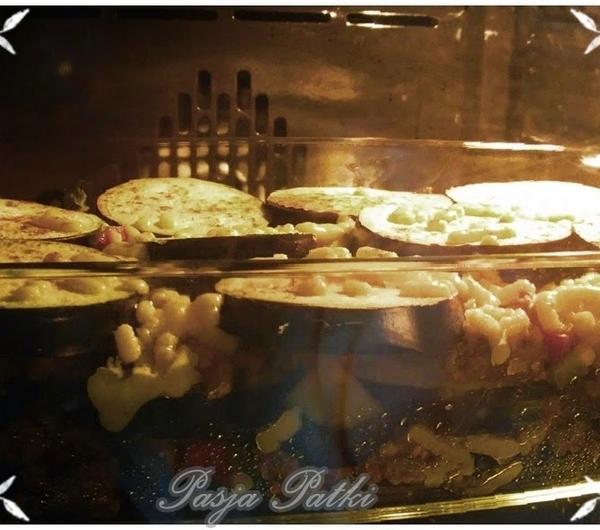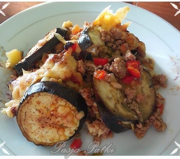 Składniki:300-400g mięsa mielonego2 średnie bakłażany (lub cukinie)2 pomidory1/2 czerwonej paprykicebulastarty żółty sersól, pieprz, papryka ostra, oreganoolej rzepakowyBakłażany dokładnie myjemy i kroimy w plastry, solimy i pozostawiamy na 10 minut. Po tym czasie płuczemy pod wodą i odstawiamy do wysuszenia.Cebulę kroimy w kostkę i podsmażamy na odrobinie oleju. Dodajemy mięso mielone, doprawiamy i smażymy około 5 minut. Dodajemy pomidory, obrane ze skóry, i paprykę kroimy w średnią kostkę. Smażymy kolejne 5 minut.Naczynie żaroodporne smarujemy olejem lub oliwą. Na dnie układamy pierwszą część bakłażana, następnie wykładamy połowę mięsa z warzywami. Układamy drugą warstwę bakłażana, na którego wykładamy pozostałą część mięsa. Na koniec układamy ostatnią warstwę bakłażana. Doprawiamy odrobiną ostrej papryki i oregano, posypujemy tartym serem.