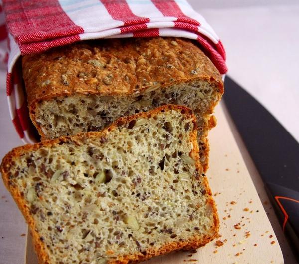 Składniki:1,5 szkl. mąki pszennej pełnoziarnistej lub mąki pszennej chlebowej typ 750 (w tej ilości zawarta jest mąka do startera chleba)1/4 szkl. płatków owsianych1/2 szkl. otrębów owsianych lub pszennych1/4 szkl. pestek słonecznika1/4 szkl. pestek dyni lub pokrojonych na kawałki migdałów (ale nie płatków migdałów)1/3 szkl. siemienia lnianego1/4 łyżki soli1/2 łyżeczki cukru25 g świeżych drożdży1 i 1/3 szkl. ciepłej wody (ok. 40 stopni)Uwaga miarka! 1 szklanka = 250 mlPrzygotowanie:Starter chleba:Drożdże, cukier, 2 łyżki mąki (odłożyć z odmierzonej mąki) i 1/2 ciepłej wody, dokładnie zmieszać i odstawić w ciepłe miejsce. Ja wstawiam miskę ze starterem chleba do piekarnika podgrzanego do 40 stopni (ale nie większej!!!).Ciasto chlebowe:Pozostałe składniki chleba dokładnie odważyć i wymieszać w dużej misce.Gdy starter chleba podwoi objętość, dodać go do suchych składników chleba i dodać resztę wody (wg przepisu).Ciasto chlebowe wymieszać dokładnie, aby składniki dobrze się połączyły.Blaszkę do pieczenia chleba posmarować olejem i posypać otrębami lub mąką - do pieczenia użyłam blaszki o wymiarach 10 x 26 cm (mierzone w górnej, szerszej części blaszki).Do wysypanej blaszki przełożyć ciasto chlebowe, odstawić w ciepłe miejsce do lekkiego wyrośnięcia (czas wyrastania max 30 minut).Chleb piec 50 minut, w piekarniku nagrzanym do 200 stopni.Po upieczeniu wyjąć chleb z blaszki i pozostawić do całkowitego wystudzenia. Następnie zawinąć chleb w czystą lnianą ściereczkę i przechowywać w chlebaku lub woreczku foliowym (niezbyt szczelnie zakręconym).Smacznego