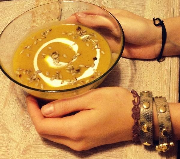 Zimno?No to krem z dyni : )Składniki:(na 6 porcji)miąższ z kilogramowej dyni2 ziemniakiłyżki eko vegetki/ bulionu vegelitr wodycurry, garam masala, cynamon, imbir, kardamon, kurkumałyżka miodusólparę kropel cytrynydo podania : prażone pestki dyni (ew. słonecznika) i jogurt naturalnyPrzygotowanie:Kroimy ziemniaki i miąższ z dyni (obojętnie jakim sposobem, mój był trudny, skomplikowany, małe efektywny)Wrzucamy je do garna z łyżką oliwy, aby się przysamżyłyGdy lekko zmiękną zalewamy je gorącym bulionem.Przyprawiamy.Gotujemy pod przykryciem około 30 minutBlendujemy wszytko na gładki krem: )Na suchej pateli przypiekamy pestki. Podajemy z łyżką jogurtu.Cieplej ?(moja bransoletka- http://www.personalstyle.pl/ )