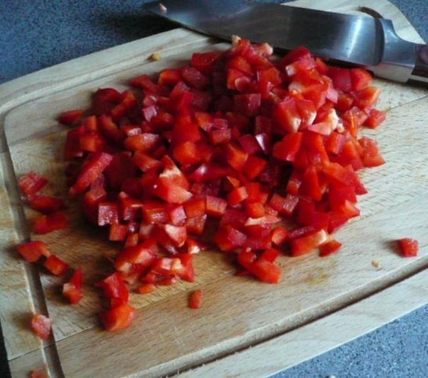 Paprykę myję, usuwam pesteczki i kroję w drobną kostkę.