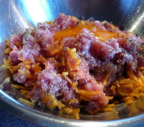 Mięso mielone mieszam z wszystkimi warzywami,