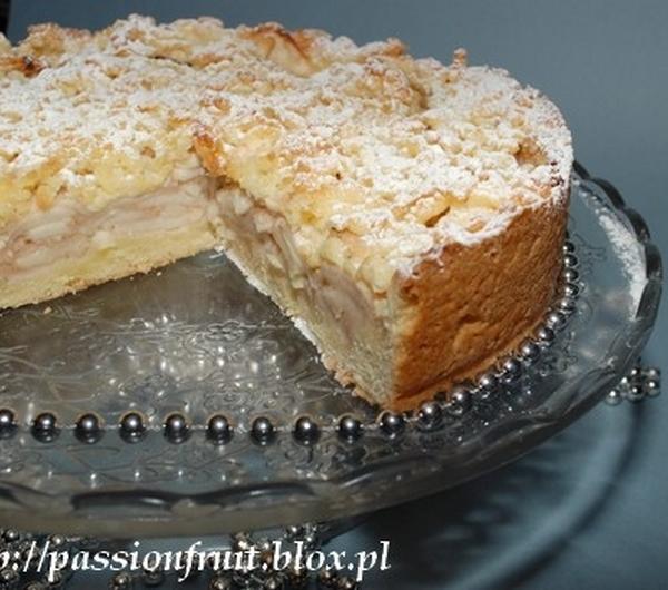 500 g mąki krupczatki250 g masła90 g cukru2 płaskie łyżeczki proszku do pieczenia2 surowe żółtka2 łyżki śmietany6-8 dużych jabłek szara reneta (nadaje się również każda inna odmiana twardych, kwaskowych jabłek)3 łyżki cukru pudru2 łyżeczki cynamonu2 łyżki bułki tartej2 łyżki soku z cytryny1. Masło ocieplić. Utrzeć dokładnie z cukrem na puszystą masę. Nadal miksując, dodawać po 1 żółtku. Dodać śmietanę i proszek do pieczenia. Do gotowej masy wsypać mąkę i zagnieść spójne, elastyczne ciasto. 2/3 ciasta wyłożyć formę do pieczenia, odstawić do lodówki. Pozostałą część ciasta włożyć do zamrażarki do schłodzenia.2. W tym czasie przygotować jabłka: obrać je, porzekroić ma pół, usunąć gniazda nasienne, pokroić w cienkie plastry. Wymieszać z cukrem, cynamonem, sokiem z cytryny i bułką tartą.3. Jabłka wyłożyć na ciasto w formie. Nakłuć je widelcem w kilkunastu miejscach. Na wierzch zetrzeć na tarce ciasto przechowywane w zamrażarce.Piec w piekarniku nagrzanym do 180 st. C ok. 50-60 minut, aż wierzch ciasta będzie rumiany. Po wystudzeniu posypać cukrem pudrem.Piekłam w okrągłej formie o średnicy 30 cm. Ciasta wystarczy także na prostokątną formę 28 cm x 24 cm. Wówczas nie ma konieczności wylepiania boków formy.