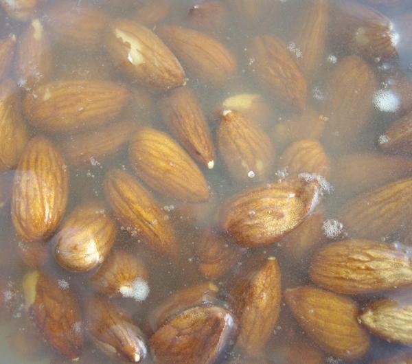Migdały zalewamy wrzątkiem i zostawiamy do wystygnięcia. Po tym czasie zdejmujemy z nich skórkę - powinna zejść bez problemu (niektóre wręcz wyskakują, przez co ganiałam je po całej kuchni)