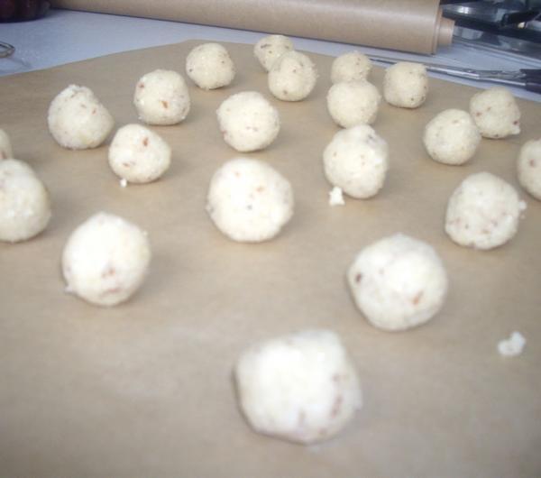 Lepimy niewielkie kulki i układamy na papierze do pieczenia. W kąpieli