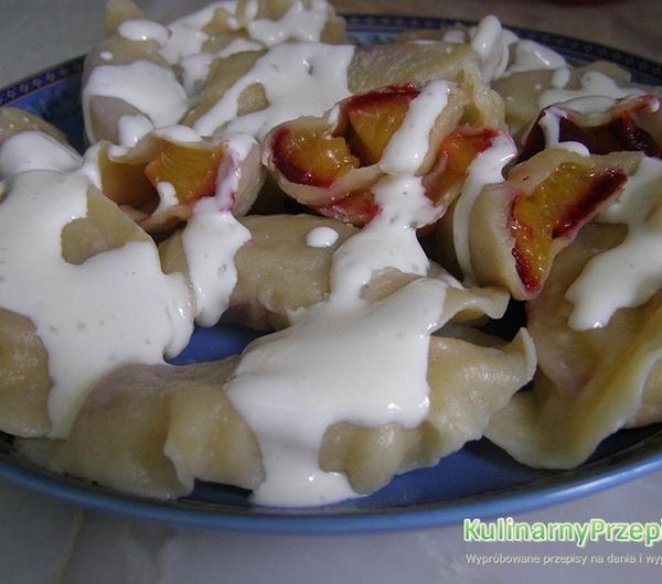 Śliwki umyć, wypestkować. Na środek każdego krążka ułożyć śliwkę ( jeśli jest za duża to przekroić) dobrze zlepić brzegi. Gotowe pierogi wrzucać do wrzącej wody, delikatnie zamieszać drewnianą łyżką, gotować na wolnym ogniu, gdy wypłyną pogotować jeszcze jakieś 2 minuty. Odcedzić, śmietanę wymieszać z cukrem pudrem polać pierogi.