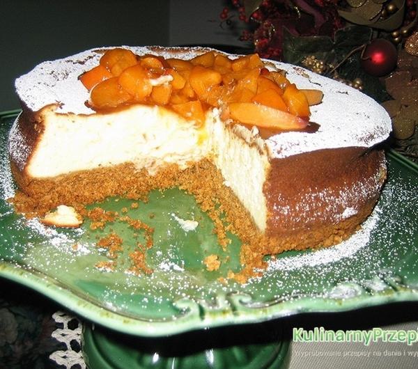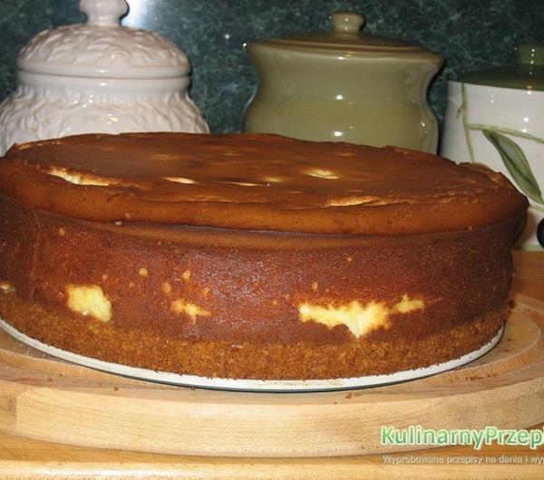 Składniki80 dkg. sera białego tłustego2 białe czekolady3 jajka1/2 szkl. cukru1/2 szkl. śmietanySpód30 dkg. herbatników1/3 kostki masłażółtkoSposób przygotowaniaHerbatniki dobrze pokruszyć, masło rozpuścić wymieszać z herbatnikami, dodać żółtko, przygotować formę o średnicy 23 cm. rozłożyć przygotowany spód. Ser dokładnie zmiksować jaja ubić z cukrem na puch ucierając ser wlać do niego ubite jaja, dodać śmietanę i rozpuszczoną i wystudzoną czekoladę.Gotową masę serową wlać na herbatniki, piec 60 minut w temp.180 *C. Po wystudzeniu można polać czekoladą albo udekorować owocami.