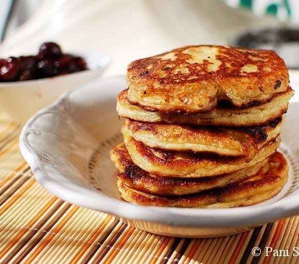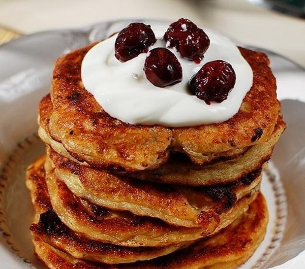 Składniki:około 10 sztuk250 g twarogu półtłustego2 duże jajka1 łyżeczka cukru wanilinowego4 łyżki mąki pszennej3 łyżki brązowego cukru1 łyżeczka proszku do pieczenia1 łyżeczka ekstraktu waniliowego1 łyżka mlekaszczypta soligarść suszonych wiśni (plus kilka do dekoracji)łyżka masła + łyżka oleju do smażeniajogurt naturalny / śmietana do podaniaWykonanie:Wiśnie kroimy na mniejsze części. Żółtka oddzielamy od białek. Białka ubijamy na sztywno. W misce rozdrabniamy twaróg i mieszamy z żółtkami, cukrem (brązowym i wanilinowym). Dodajemy ekstrakt i mleko. Mąkę, sól i proszek do pieczenia przesiewamy i dodajemy do twarogu. Mieszamy. Do masy twarogowej dodajemy ubite białka, ponownie delikatnie mieszamy i dorzucamy wiśnie.Masło z olejem rozgrzewamy na patelni. Przygotowane ciasto wylewamy na patelnię, formując niewielkie placuszki. Smażymy z obu stron.Podajemy z kleksem jogurtu naturalnego lub kwaśnej śmietany. Przyozdabiamy suszonymi wiśniami.Smacznego!