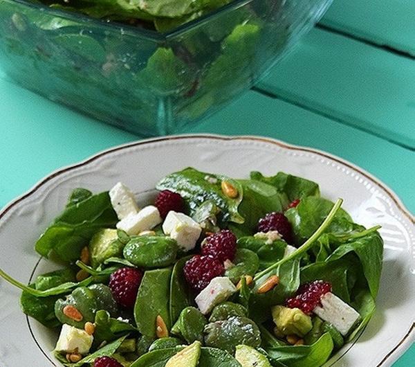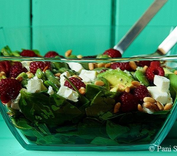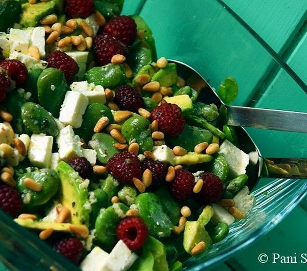 Składniki:150 g świeżego szpinaku baby500 g bobu200 g fety250 g malin3-4 łyżki orzeszków pinii1 awokadoDressing:łyżka soku z cytryny3 łyżki oliwy z oliwek1 ząbek czosnkuszczypta bazyliisólpieprzWykonanie:Pinie prażymy chwilę na suchej patelni. Do wrzącej, osolonej wody wrzucamy bób i gotujemy 8 minut. Odcedzamy, przelewamy zimną wodą i obieramy z łupin. Ser feta kroimy w kostkę. Szpinak myjemy, maliny przepłukujemy wodą.Awokado obieramy, kroimy w plasterki, przekładamy do miseczki, skrapiamy odrobiną soku z cytryny, delikatnie solimy i pieprzymy. Odstawiamy na 5 minut.Dressing: czosnek przeciskamy przez praskę, mieszamy z oliwą i sokiem z cytryny. Dodajemy bazylię oraz solimy i pieprzymy. Dokładnie mieszamy.Do miski przekładamy szpinak, bób, awokado i fetę. Polewamy dressingiem. Na koniec dodajemy maliny i orzeszki piniowe.Smacznego!