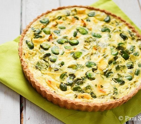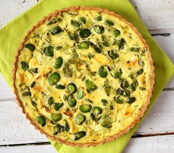Ciasto:110 g bardzo zimnego masła180 g mąki pełnoziarnistej z orkiszu½ łyżeczki soli3 łyżki lodowatej wodyNadzienie:500 g bobu (waga ze skórką)200 g sera koziego roladki4 jajka25 g sera długodojrzewającego200 g śmietany 12%100 ml jogurtu60 ml mleka3 ząbki czosnkunatka pietruszkisólpieprzWykonanie:Ciasto: W malakserze umieszczamy mąkę i sól i w trybie pulsacyjnym mieszamy przez chwilę. Dodajemy masło i mieszamy. Powstaną nam okruchy przypominające kruszonkę. Następnie dodajemy wodę i chwilę pulsujemy. Wszystkie składniki powinny się połączyć.Ciasto wykładamy na stolnicę podsypaną mąką i chwilę zagniatamy rękoma. Gotowe ciasto formujemy w kulę, zawijamy w folię spożywczą i wkładamy do lodówki na godzinę.Po tym czasie wyjmujemy ciasto na, delikatnie posypaną mąką, stolnicę i po odczekaniu około 5 minut rozwałkowujemy na wielkość formy. Następnie przenosimy ciasto na dno formy, wyklejając również boki. Wkładamy ponownie do lodówki. Po około 30 minutach wykładamy na ciasto folię aluminiową lub papier do pieczenia (żeby był bardziej plastyczny możemy go najpierw zgnieść) i wysypujemy na nie ceramiczne kulki do pieczenia (groch, fasolę lub ryż jeśli nie posiadamy kulek) do około 2/3 wysokości. Piekarnik nagrzewamy do 180°C i pieczemy spód przez 15 minut. Po tym czasie zdejmujemy z ciasta obciążenie, nakłuwamy spód widelcem (nie zapomnijcie o tym, bo zrobią się bąble!) i ponownie pieczemy około 10 minut. Ciasto powinno nabrać delikatnie złotego koloru. Gdy będzie gotowe, wyjmujemy z piekarnika.W trakcie, gdy ciasto będzie się chłodzić w lodówce przygotowujemy nadzienie: bób gotujemy 3 minuty w osolonym wrzątku. Przelewamy go zimną wodą i obieramy z łupinek. Roladkę kozią kroimy w grubszą kostkę. Natkę pietruszki siekamy, ser długodojrzewający trzemy na tarce o małych oczkach, a czosnek przeciskamy przez praskę.Jajka roztrzepujemy w misce i dodajemy do nich długodojerzwający ser, śmietanę , jogurt, mleko i czosnek. Doprawiamy solą i pieprzem. Dorzucamy obrany bób (część możemy zostawić do posypania wierzchu), natkę pietruszki i kozi ser.Nadzienie wylewamy na upieczony spód. Pieczemy w piekarniku nagrzanym do 180°C przez około 30 – 35 minut.Podajemy na ciepło lub zimno.Smacznego!