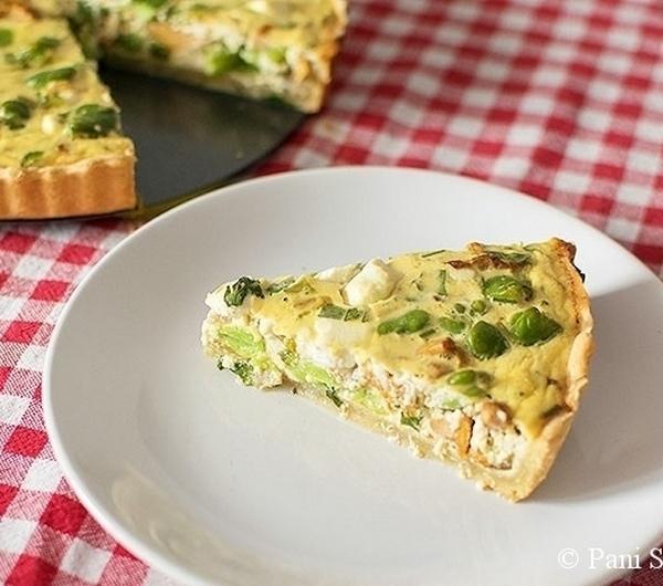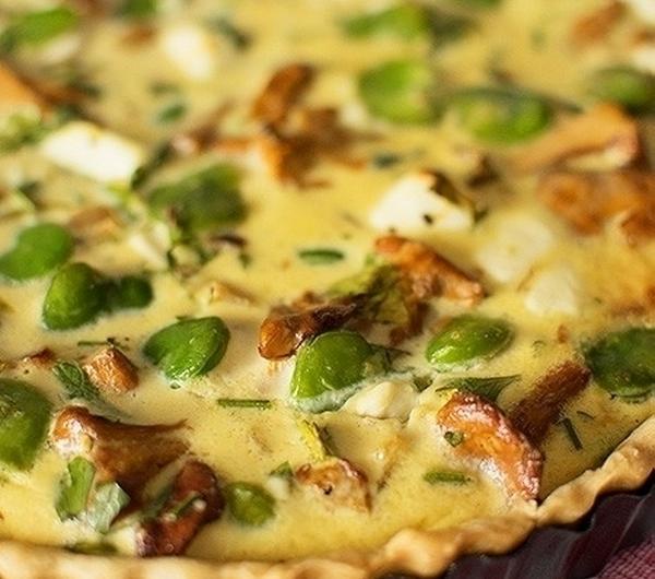 Składniki: na formę o średnicy ok.25 cmKruche ciasto:115 g bardzo zimnego masła215 g mąki pszennej½ łyżeczki soli3 łyżki lodowatej wodyNadzienie:200 g kurek500 g bobu (waga z łupinkami)150 g sera typu feta3 duże jajka280 g śmietany 12%nieduża biała cebula10 g masła½ pęczka natki pietruszkisólpieprzWykonanie:Kruche ciasto: Masło kroimy w 1,5 cm kostkę. W malakserze (możemy również ugniatać w misce) umieszczamy mąkę oraz sól i w trybie pulsacyjnym mieszamy przez chwilę. Następnie dodajemy masło i „puslujemy” w malakserze, dopóki nie powstanie coś na kształt kruszonki. Dodajemy wodę i ponownie chwilę pulsujemy.Wykładamy ciasto na czystą i gładką powierzchnię i chwilę rękoma zagniatamy. Jeśli będzie się kleiło do rąk możemy podsypać je mąką. Gotowe ciasto formujemy w kulę, zawijamy w folię spożywczą i wkładamy do lodówki na godzinę. Po tym czasie wyjmujemy ciasto na, delikatnie posypaną mąką, stolnicę i po odczekaniu około 5 minut rozwałkowujemy na wielkość formy. Następnie przenosimy ciasto na dno formy, wyklejając również boki.Wkładamy ponownie do lodówki. Po około 30 minutach nakłuwamy widelcem i wyścielamy folią aluminiową lub papierem do pieczenia (żeby był bardziej plastyczny możemy go najpierw zgnieść) i wysypujemy na nie ceramiczne kulki do pieczenia (groch, fasolę lub ryż jeśli nie posiadamy kulek) do około 2/3 wysokości.Piekarnik nagrzewamy do 200°C i pieczemy spód przez 20 minut.Nadzienie: kurki myjemy , większe przekrawamy. Cebulę i ser typu feta kroimy w kostkę. Ser Natkę pietruszki siekamy.Na patelni rozpuszczamy masło i szklimy na nim cebulę. Dodajemy kurki. Solimy oraz pieprzymy i po około 5 minutach zdejmujemy z gazu.W niedużym garnku zagotowujemy wodę, solimy i wrzucamy bób. Po 2 minutach wyciągamy i przelewamy zimną wodą. Obieramy z łupinek.Do miski wlewamy lekko roztrzepane jajka, śmietanę i mieszamy. Dodajemy obrany bób, podsmażone kurki z cebulą, fetę i pietruszkę. Doprawiamy solą i pieprzem.Na podpieczone ciasto wylewamy nadzienie i wkładamy do piekarnika na kolejne 30 minut.Podajemy od razu na ciepło lub jako przekąskę na zimno.Smacznego!