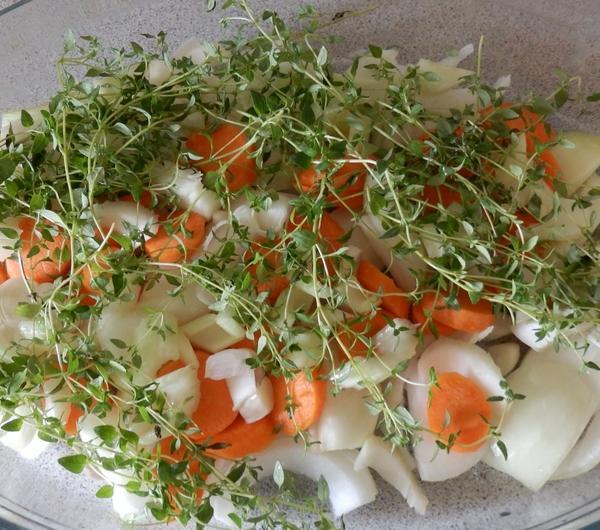 SkładnikiKurczak (około 1,5 kg)2 cebule2 marchewki2 łodygi selera naciowegoGłówka czosnkuOliwaSól, pieprzCytrynaPęczek tymianekPrzygotowanieWyjmij kurczaka z lodówki i odstaw.Piekarnik nastaw na 240 stopni.Pokrój grubo wszystkie warzywa, czosnek podziel na ząbki, lub pokrój w poprzek na plastry.Ułóż kopiec z warzyw na blaszce lub w naczyniu żaroodpornym, na wierzchu ułóż większą część tymianku, skrop całość oliwą.Umyj kurczaka w zimnej wodzie, skrop oliwą, natrzyj solą i pieprzem.Sparzoną cytrynę ostrożnie ponakłuwaj czubkiem ostrego noża.Cytrynę wraz z resztą tymianku włóż do tuszki.Połóż kurczaka w naczyniu żaroodpornym z warzywami i ziołami, włóż do piekarnika.Natychmiast zmniejsz temperaturę do 200 stopni. Piecz około 1 , 5 godziny.Wspaniałym dodatkiem do kurczaka będą pieczone ziemniaki. Wystarczy obrane ziemniaki w całości wrzucić na blaszkę w połowie pieczenia mięsa. Skropić oliwą, posypać solą i pieprzem i tyle.Smacznego!