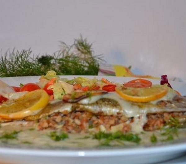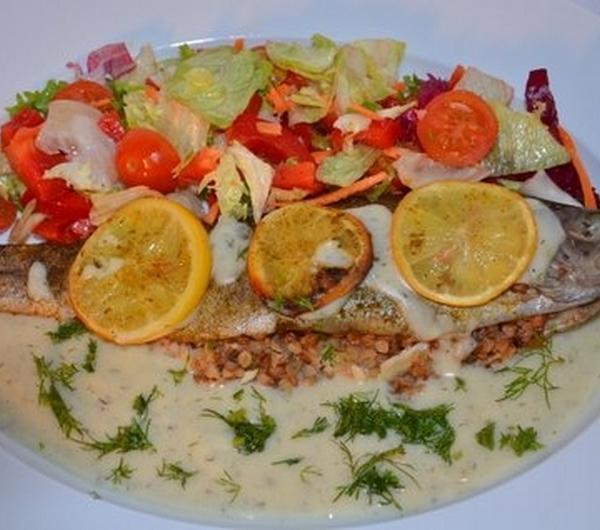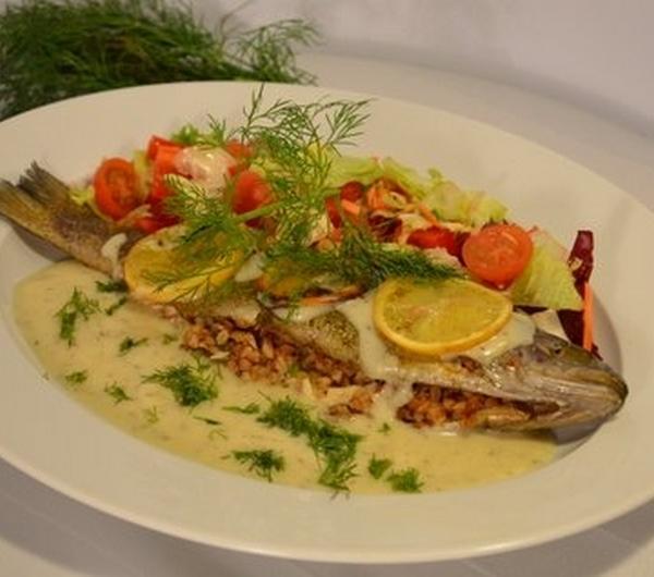 Pstrąg grillowany nadziewany kaszą gryczaną podawany z sosem śmietanowo-koperkowym i sałatką.