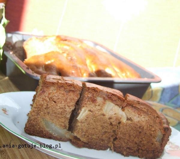 Składniki:2 szklanki mąki Luksusowej Puszystej Lubella typ 5501 jajo3/4 szklanki cukru1/2 szklanki oleju1 szklanka mleka2 łyżki miodu2 łyżeczki sody3-4 łyżeczki przypraw korzennych ( u mnie 2 cynamonu, 1 do piernika, 1/4 gałki i imbiru)350 g dojrzałych gruszek, 4 nieduże sztukiolej i bułka tarta do formyRozgrzać piec do 180 stopni, góra dół bez termoobiegu.Foremkę wysmarować olejem i obsypać bułką tartą.Gruszki umyć, obrać i pokroić w półplasterki.Składniki zmiksować w dowolnej kolejności, powinno to trwać ok 5 minut.Ciasto wlać do formy i piec 40-50 minut. Po 40 sprawdzamy patyczkiem czy jest gotowe – suche.Możemy posypać cukrem pudrem lub oblać polewą, ja tego nie robię bo wtedy to ciasto jakoś bardziej swojsko mi się kojarzy, ale w wersji odświętnej jak najbardziej polecam!A teraz krok po kroku:
