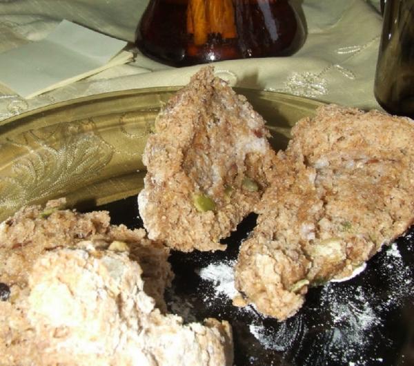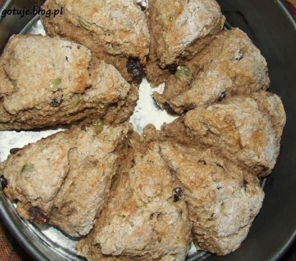 Składniki na 8 sztuk220 g mąki pszennej razowej 18501/2 szklanki pestek dyni1/2 szklanki rodzynek1/2 szklanki siemienia lnianego5 łyżek otrąb pszennych ( możecie zastąpić zarodkami lub płatkami owsianymi)1 duże jajo100 ml mleka100 ml jogurtu naturalnegopłaska łyżeczka soliłyżka cukru1 łyżeczka octu1 łyżeczka proszku do pieczenia1/2 łyżeczki sodyPrzygotowanie :Piec nastawić na 210 stopni, góra dół z termoobiegiem. Blachę wysypać mąką.Wymieszać sypkie składniki ( prócz sody). Dodać ziarna.Jajo wymieszać z mlekiem, octem,sodą i jogurtem. Dolać do suchych. Wymieszać ciasto. Przełożyć na blat, uformować koło , pociąć je na 8 części i ułożyć na blasze lub jak ja w tortownicy.Piec od 15 minut.