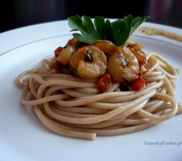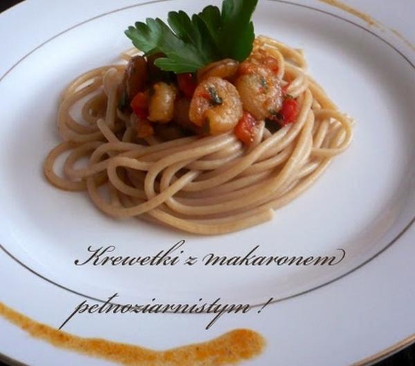 Dokładnie za tydzień obchodzone są walentynki i z tej okazji przygotowałam dla Was propozycję obiadu/kolacji, którą możecie wykorzystać właśnie tego dnia.Długo się zastanawiałam co powinno być głównym składnikiem takiej kolacji,ale po namyśle padło na krewetki, których w zasadzie nigdy wcześniej nie jadłam !Na szczęście potrawa mi się udała, moja druga połówka bardzo sobie chwaliła...także jest dobrze !Kilka słow o wartości odżywczej krewetek:źródło pełnowartościowego i łatwo przyswajalnego białka,krewetki sa lekkostrawne i niskokaloryczne,zawierają witaminy z grupy B, jod, selen, wapń i fluor.Składniki :krewetki koktajlowe- 250gpapryka- 1/2 sztuki (ok. 100g)mleczko kokosowe- 2 łyżeczkipietruszka nać- 4 łyżeczki (ok. 24g)mąka pełnoziarnista- 1 łyżkaolej- 1 łyżkawoda- 2 łyżkibazyliaoreganopapryka słodkapieprzsólczosnek- 3 ząbkimakaron spaghetti pełnoziarnisty-140gPrzepis:Krewetki odmrozić, wypłukać, wsypać do miski i dodać przyprawy,mąkę, wodę, drobno pokrojoną natkę pietruszki, olej i mleczko kokosowe- wymieszać i zostawić na pół godziny.Paprykę i czosnek pokroić w drobną kosteczkę- dodać do krewetek. Po poł godzinie krewetki należy umieścić w naczyniu żaroodpornym i piec w piekarniku przez około 20 minut w temperaturze 170 stopni.Makaron ugotować i odcedzić, podawać z krewetkami.Jedna porcja dostarcza:B-32 , 5 g T-9 g W- 67g E- 474 kcal WW- 7