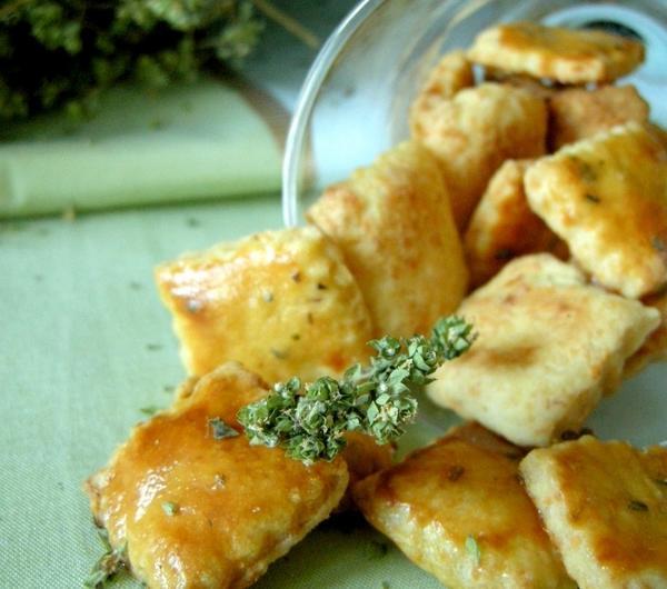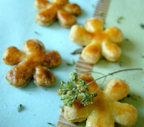 Pierwsze ciasteczka w tym roku akademickim, pieczone na potrzeby koła. To takie trochę prawiczki :) Ale całkiem temperamentne. Multi-kulti: z dodatkiem wspomnianego oregano (albo jak sobie go śmiesznie nazwiecie), przywieziony w tym roku w paczce z Włoch. Więc świeżo ususzone (nie wiem czy coś może być jednocześnie świeże i ususzone, ale czemu nie, umówmy się, że może), bardzo ładnie pachnące. Musztarda Dijon, mały żółty słoiczek z Paryża. I akcent lokalny, dobre bo polskie, oscypek zamiast, jak proponował przepis, cheddara. Nie wiedziałam, że nasz polski oscypek daje taki fajny smak. Jest lekko ostry - ale nie w sensie pikantny, tylko wyrazisty. Sto razy lepszy niż cheddar. A ja się za angielskim serem tyle razy uganiałam!Przepis z książki 1001 Cupcakes, Cookies & other tempting treats Susanny Tee.Składniki:150 g mąki pszennej150 g oscypka - żółtego, nie białego (to w mojej wersji, w oryginale był cheddar)150 g miękkiego masła pokrojonego w kostkę1 łyżeczka musztardy Dijon (albo innej lekko ostrej)1 żółtkoduża szczypta soliszczypta pieprzu na wierzch: żółtko, łyżka mleka, łyżka oreganoPrzygotowanie:Do dużej miski przesiej mąkę i zetrzyj do niej na tartce o małych oczkach ser, dorzuć sól i pieprz. Wymieszaj.Dodaj pokrojone w kostkę masło i rozetrzyj palcami jak kruszonkę, dopóki składniki nie zaczną się sklejać. Wbij do środka żółtko, dodaj łyżeczkę musztardy i zagnieć całość na gładkie ciastko. Uformuj kulę, owiń folią, włóż do lodówki na minimum pół godziny (jak pół godziny, to na półkę najbliższej zamrażalnika).Nagrzej piekarnik do 200 stopni C. Wyciąg schłodzone ciasto, rozwałkuj na cienki placek i wycinaj z niego ciasteczka foremkami. Gotowe układaj na blasze wyłożonej pergaminem i każde posmaruj pędzelkiem zanurzonym w żółtku rozmemłanym z mlekiem i oregano. Wstaw do piekarnika i piecz ok. 10-12 minut, aż wierzch będzie ładnie zezłocony.