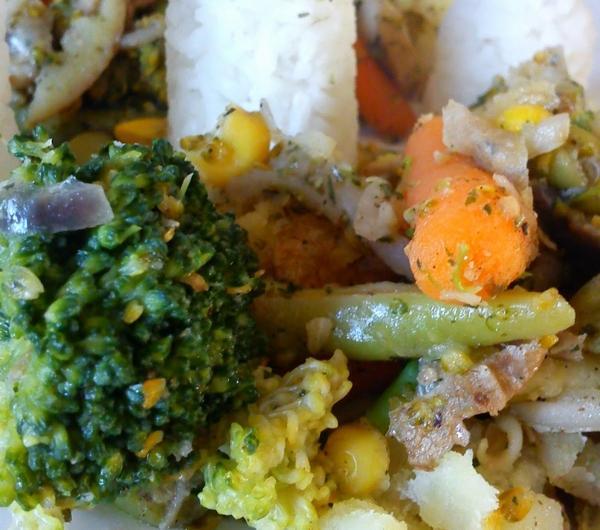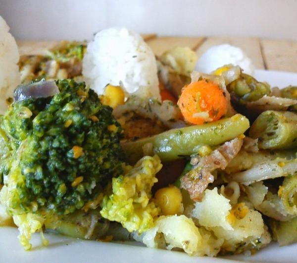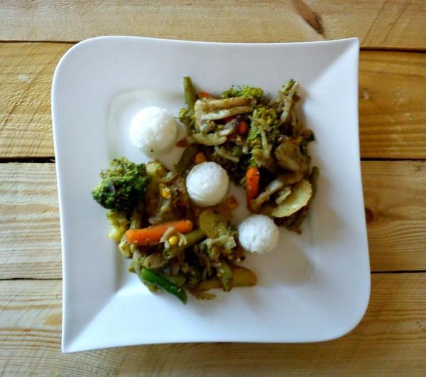 Składniki:mrożone:- kilka różyczek brokuła- garść fasolki szparagowej- garść małych marchewek- garść kukurydzy- garść plastrów ziemniaka- garść papryki zielonejświeże:- pół cebuli drobno pokrojonej- garść pieczarekSkładniki mieszanki ziołowej:- oregano pół łyżeczki- pieprz czarny mielony szczypta- majeranek pół łyżeczki- bazylia pół łyżeczki- czosnek granulowany pół łyżeczki- świeża natka pietruszki kilka gałązekWykonanie:Na patelni teflonowej rozgrzać łyżkę oliwy z oliwek, najpierw podsmażyć pieczarki pokrojone w plastry, oraz cebulę. Następnie wrzucić warzywa i podsmażać co jakiś czas mieszając, przez około 10 minut. Pod koniec podsmażania przygotować mieszankę ziołową z wszystkich ziół oraz świeżej natki, i dołożyć do warzyw.Jeżeli nie lubicie mrożonych warzyw, możecie użyć świeżych, lecz najpierw trzeba je zblanszować kilka minut w lekko posolonej wodzie.Podawać na przykład z ryżem :)Smacznego!