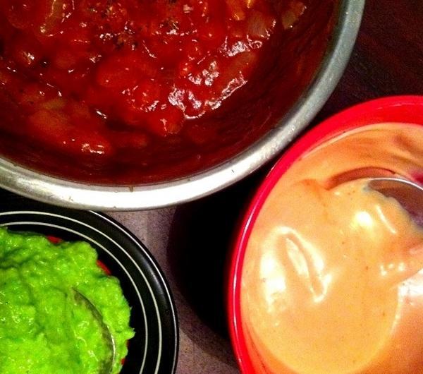 Do sosu słodkiego:2 łyżki ketchupu2 łyżki majonezupół łyżeczki słodkiej paprykipół łyżeczki cukruWszystko mieszamy ze sobą. Smacznego!(zielony sos na zdjęciu to wasabi)