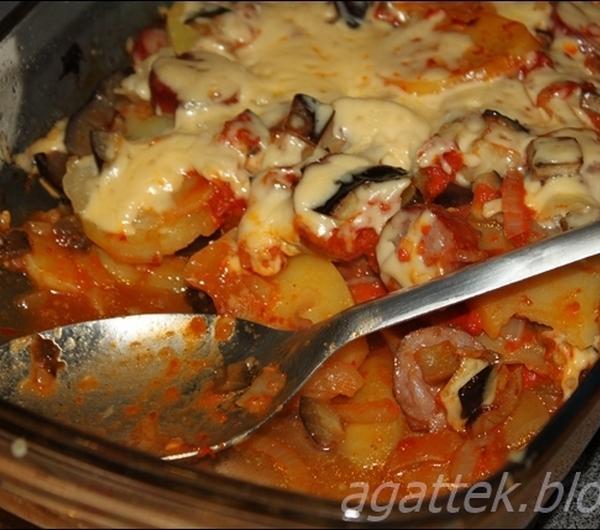 Proste i szybkie w przygotowaniu danie, znalazłam u Dzikowiec od kuchni, tak mnie urzekło swoją prostotą, że postanowiłam je zrobić i nie rozczarowałam się :-)Składniki:4 średnie ziemniaki1 mały bakłażan1 laska dobrej kiełbasy2 cebule1 słoik ajwaruser żółtytłuszcz do smażeniasól, pieprzWykonanie:Bakłażana umyć, pokroić w plastry, posolić i odstawić na 20 minut. Ziemniaki obrać i pokroić w bardzo cienkie plastry.Na rozgrzanym tłuszczu podsmażyć pokrojoną w plasterki kiełbasę, w połowie smażenia dodać pokrojoną cebulę. Wszystko razem chwilę posmażyć.Plastry bakłażana opłukać z soli i wytrzeć papierowym ręcznikiem. Pokroić w kostkę.Naczynie żaroodporne wysmarować tłuszczem i układać w nim warstwami najpierw 1/3 ziemniaków, przyprawić solą i pieprzem, 1/3 kiełbasy z cebulą, 1/3 bakłażana oraz 1/3 część słoika ajwaru. Czynność powtórzyć do momentu wyczerpania składników.Naczynie przykryć przykrywką lub folią i wstawić do nagrzanego piekarnika do temp. 170 st.C piec ok. 60 minut, aż ziemniaki będą miękkie. Pod koniec pieczenia posypać wierzch startym żółtym serem.Smacznego :-)