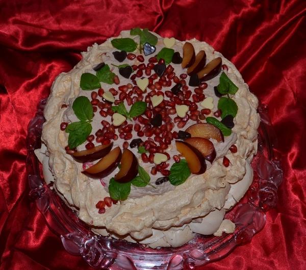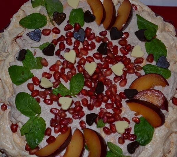 Dziś w domu przygotowywałam tatara a że białka zostają pomyślałam sobie przygotuję bezę, a że były białka jeszcze w zamrażalce to bez obaw zabrałam się za przygotowywanie tortu Pavlowa.Wyszła bardzo delikatna rozpadająca się pod dotykiem, bardzo krucha w środku ciągnąca jednym słowem pianka. Największym problemem było przełożenie na paterę .Składniki600 ml białek60 dag cukru1 łyżka skrobi kukurydzianejskładniki kremu500ml śmietany 36%25 dag ser mascarpone1 deser słodka chwila budyń z płatkamiczekolady5 dag orzechów włoskich mielonych BackMit2 łyżki cukru pudru Kupiec4 śmieta n fix Dr Oetkera5g margaryny KasiaDekoracjeserduszka Dr Oetkeraśliwkiowocgranatuświeża miętaczekoladapisaki dekoracyjne Dr OetkeraDo miski wlewamy połowę białek które ubijamy pod koniec dodajemy 30dag cukru,ubijamy jeszcze chwilę do uzyskania sztywnej masy.Wykładamy blachę papierem do pieczenia który smarujemy margaryną Kasią na którym rysujemy okrąg o średnicy 24 cm. Nagrzewamy piekarnik do 120-145 stopni i suszymy bezę przez około 60-120 minut.Drugą bezę robimy w podobny sposób tylko dosypujemy łyżkę skrobi kukurydzianej.Przygotowanie kremuDo miseczki wsypujemy deser budyń z płatkamiczekolady który zalewamy 175 ml gorącej wody mieszamy przez minutę pozostawiamy w chłodnym miejscu do wystygnięcia.Do miski wlewamy śmietanę którą ubijamy pod koniec ubijania dodajemy cukier puder wymieszany z 3 śmietan fix następnie dodajemy po łyżce serekmascarpone i zimny budyń z płatkamiczekolady dodajemy orzechy mielone wszystko mieszamy.Na paterę kładziemy bezę którą posypujemy śmietan fix który zabezpiecza bezę przed rozpuszczeniem na to kładziemy krem przykrywamy drugą bezą smarujemy kremem na który kładziemy świeże owoce, serduszka z czekolady,czekoladęmiętę i inne dekoracje z czekolady .Fakt, prawidł owo to jest tort Pavlowej i wymyślili go Australijczycy. :)Dzię ki annamaria .