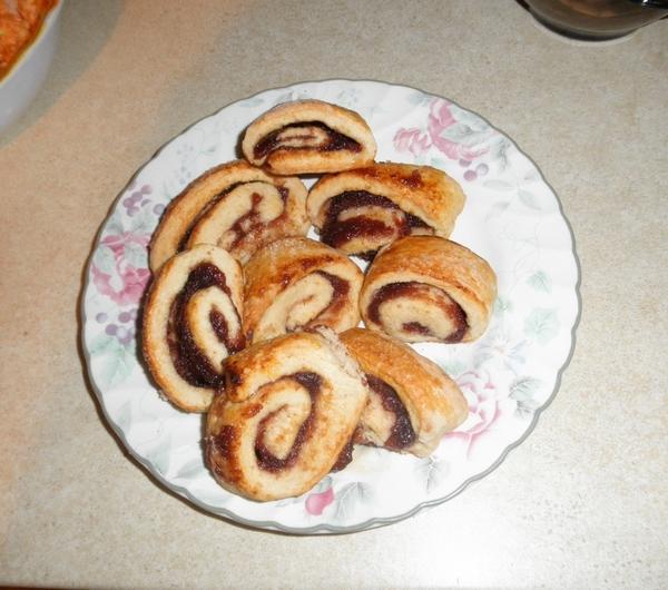 2. Ciasto owijamy folią i wkładamy na 1 godzinę do zamrażalnika. Po schłodzeniu wałkujemy na prostokąt smarujemy marmoladą i zwijamy w roladę. Kroimy na 2 cm kawałki i układamy na blaszce. Ciasta smarujemy jajkiem i posypujemy cukrem.