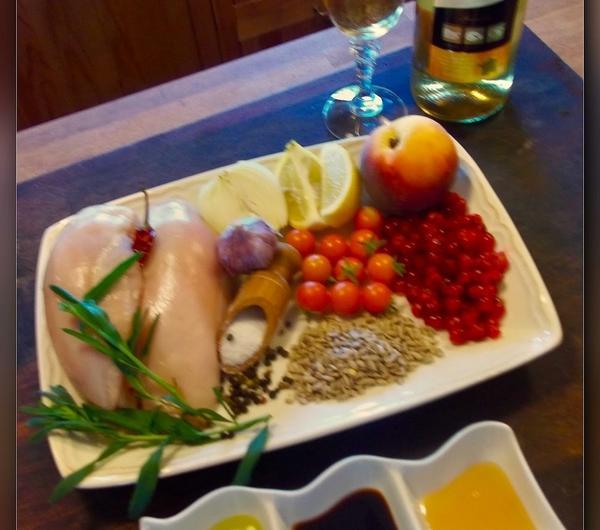 Składniki:* mięso, piersi kurczaka 1 kg* czerwona porzeczka (kilkanaście szypułek)* brzoskwinia (1-2 sztuki)* cytryna* słonecznik* papryczka chilli (wedle uznania)* czosnek (1 mała główka, koniecznie pamiętajmy nie chiński...)* cebula (mała)* pomidorki koktajlowe (do dekoracji)* świeży rozmaryn (2-3 gałązki)* wino, białe półwytrawne* pieprz, sól* oliwa z oliwek (3-4 łyżki)* sos sojowy ciemny (5 łyżek)* miód ( 2-3 łyżki)* masło (3-4 łyżki)Wykonanie:Przygotowanie samej potrawy, nie jest specjalnie czasochłonne i skomplikowane, ale ze względu na czas jaki mięso trzymamy w zalewie, należy pamiętać, że przygotowania zaczynamy z co najmniej 3-4 godzinnym wyprzedzeniem. Właściwie to najlepiej byłoby zostawić piersi w marynacie na całą noc, ale dla niecierpliwych powinno wystarczyć te 3-4 godziny w lodówce.