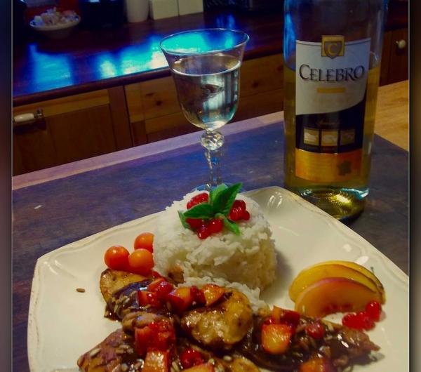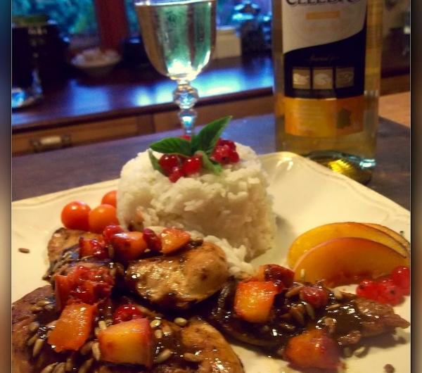 Tyle wywodów, czas na sam przepis, który dodam, zrobiłem głównie pod kątem wykorzystania czerwonej porzeczki i brzoskwini, ponieważ te dwa smaki kwaskowaty porzeczki i przesłodki brzoskwini dały wyjątkowo oryginalny posmak potrawie, którą całość zwieńczył smak białego wina. Dodatkowo prośba, aby wybaczyć mi ten zapewne nie co przy długi tytuł dzisiejszej potrawy.