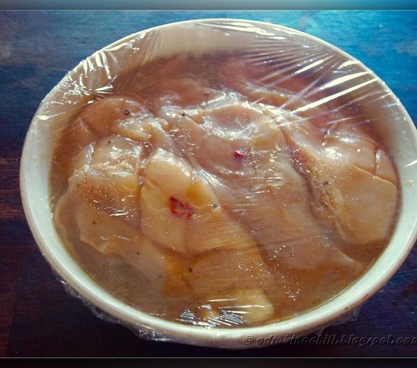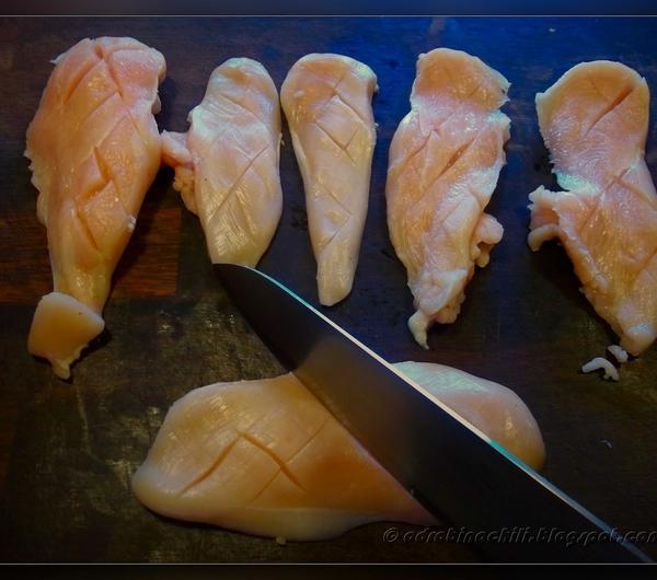 * piersi po opłukaniu i osuszeniu w ręczniku papierowym kroimy pod kątem na dwie połowy.* następnie nacinamy połówki kurczaka, w poprzeczne linie, mięso lepiej "wchłonie" zalewę i dodatkowo nie będzie wymagało dłuższego smażenia, dzięki czemu uzyskamy soczyste mięso. Pamiętajmy, pomimo tego, że mięso kurczaka jest delikatne i nie wymaga zbyt długiej obróbki termicznej zwłaszcza na patelni, to i tak często popełnianym błędem jest właśnie zbyt długie smażenie, co w efekcie daje suche mięso.* mięso natrzeć solą i świeżo startym pieprzem